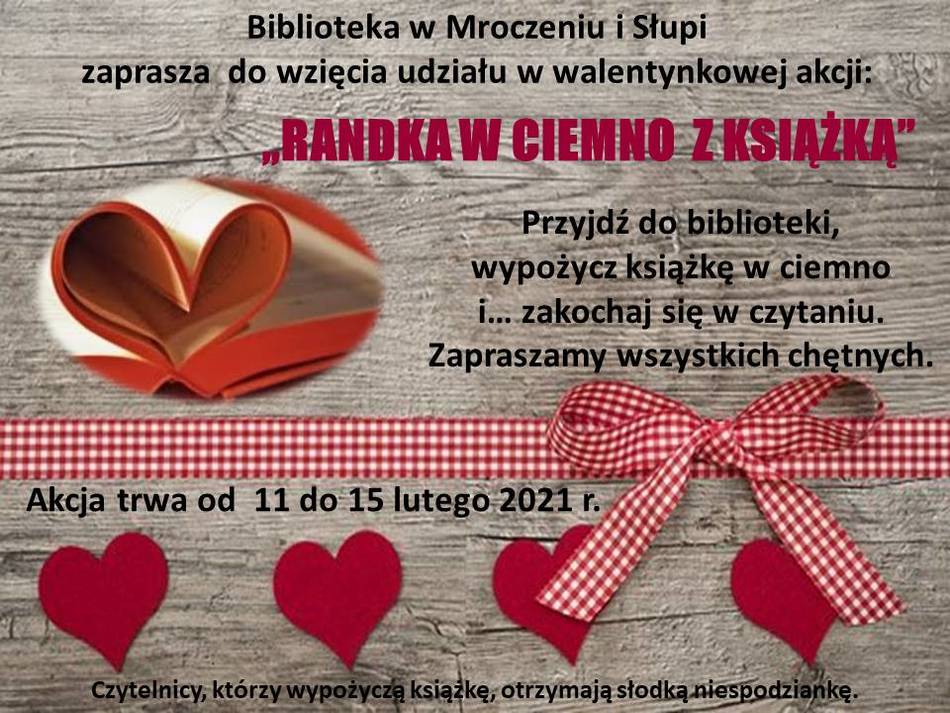 Z okazji walentynek od 11 do 15 lutego w filiach bibliotecznych w Mroczeniu i Słupi trwała akcja „Randka w ciemno z książką”, zachęcająca do czytania pod hasłem "Przyjdź, wybierz