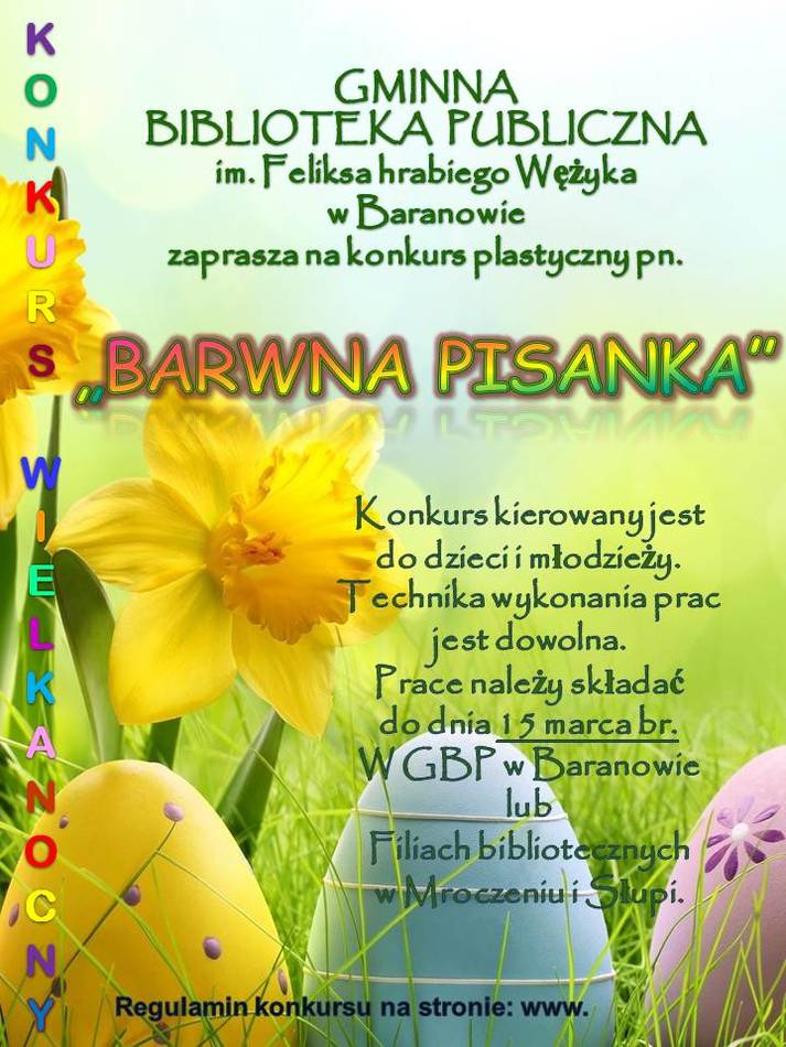 Gminna Biblioteka Publiczna w Baranowie wraz z filią biblioteczną w Mroczeniu i Słupi po raz kolejny zorganizowała Gminny Konkurs Wielkanocny, pod hasłem: „Barwna pisanka”. Celem konkursu było: kultywowanie