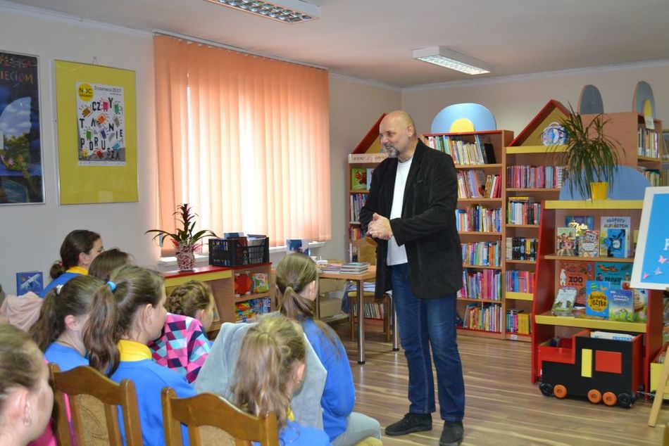 Wśród dzieci uczestniczących w spotkaniu byli uczniowie Szkoły Podstawowej w Baranowie i Donaborowie, którzy przybyli do biblioteki pod opieką swoich nauczycieli. Na początku spotkania pisarza przywitała dyrektor biblioteki