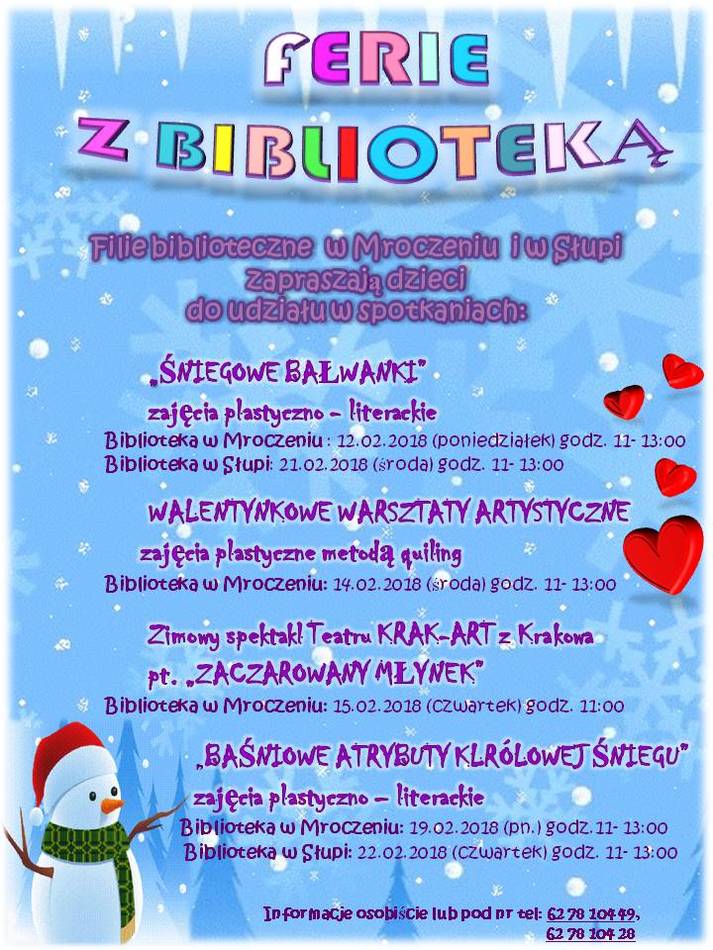 Serdecznie zapraszamy dzieci do Filii Bibliotecznej w Mroczeniu i Słupi na spotkania kulturalno-edukacyjne pt. "FERIE Z BIBLIOTEKĄ"