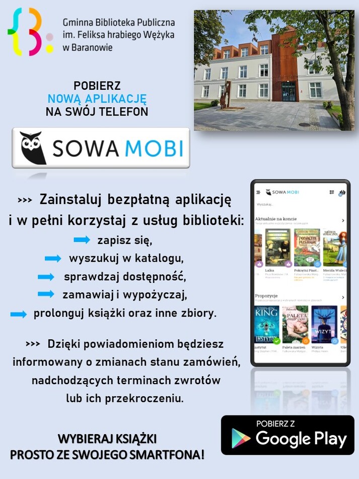 Zapraszamy do korzystania z nowoczesnej usługi w Bibliotece. Aplikacja SOWA MOBI umożliwia czytelnikowi korzystanie z katalogu Biblioteki oraz konta czytelnika za pomocą smartfona lub tabletu. Aplikację można pobrać