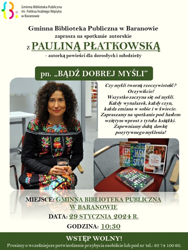 Gminna Biblioteka Publiczna w Baranowie organizuje spotkanie autorskie z Panią Pauliną Płatkowską, które odbędzie się w dniu 29 stycznia 2024 roku.