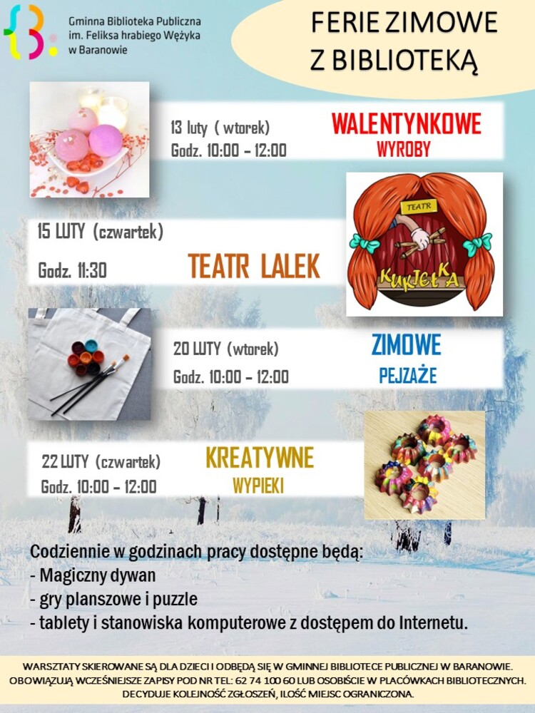 Zapraszamy dzieci na Ferie zimowe z Biblioteką. Szczegóły na plakacie. Zapraszamy!