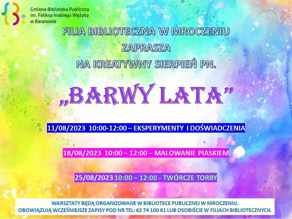 W Filii bibliotecznej w Mroczeniu zakończyliśmy tegoroczne warsztaty wakacyjne dla dzieci pn. „Barwy lata”, które odbywały się od 11 do 25 sierpnia. Dzięki ich różnorodności najmłodsi mogli rozwijać