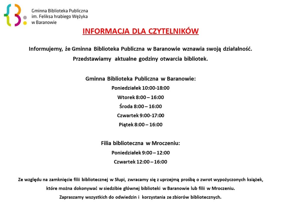 W związku z wznowieniem działalności Gminnej Biblioteki Publicznej w Baranowie przedstawiamy nowe godziny otwarcia.