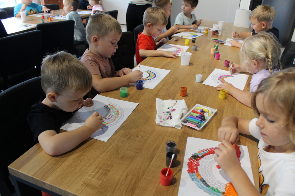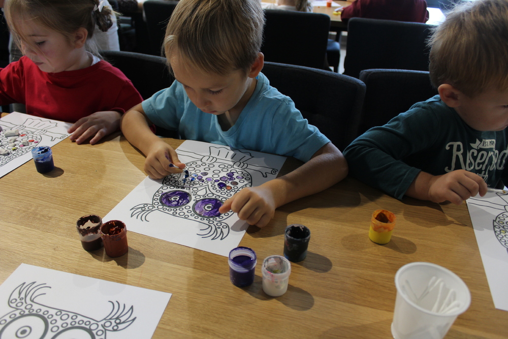 W drugiej części spotkania, dzieci podobnie jak Vashti, bohaterka książki, zaczęły tworzyć własne kompozycje złożone z kropek. Przy użyciu patyczków do uszu lub plasteliny każdy projektował własne kropkowe arcydzieło. Było wesoło, kreatywnie i twórczo. Zachęcamy do wypożyczania książek pt. “Kropka”, „ Naciśnij mnie” i “Och. Książka pełna dźwięków”, które są dostępne w bibliotece.