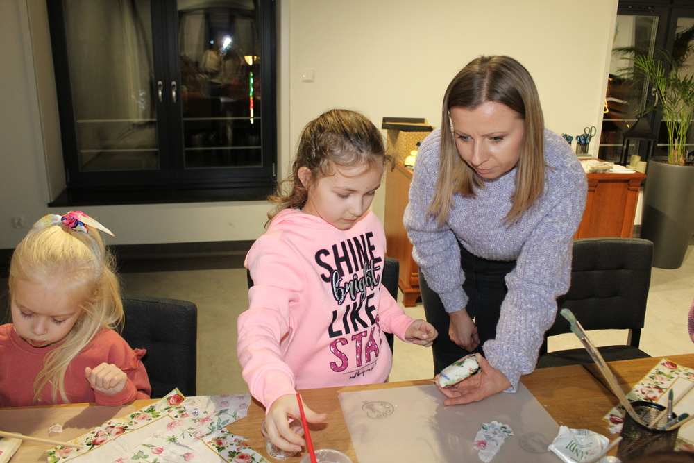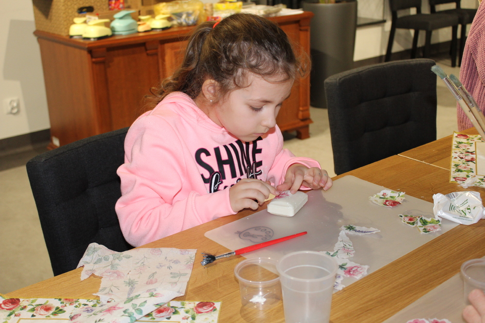 Na początku spotkania poznały kreatywną technikę ozdabiania mydła za pomocą papierowych serwetek, tworząc efekt tzw. „metody decoupage”. Podczas warsztatów uczestnicy dowiedzieli się jak przygotować serwetki, jak je kleić, aby osiągnąć efektowny wygląd. Następnie starannie wykonywały swoje prace. Za pomocą tej wyjątkowej techniki dzieci stworzyły niezwykłe i barwne dzieła.