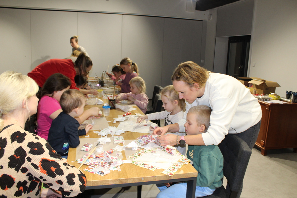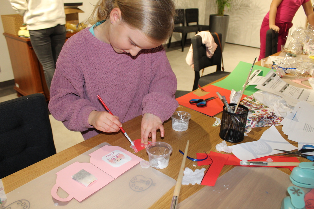 W kolejnej części warsztatów, wykonały również kolorowe laurki. Przy pomocy dostępnych szablonów, uczestnicy wycinali i ozdabiali, dopełniając kartki życzeniami oraz herbatkami. Przygotowane laurki wyszły twórczo i oryginalnie.