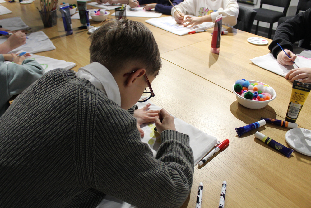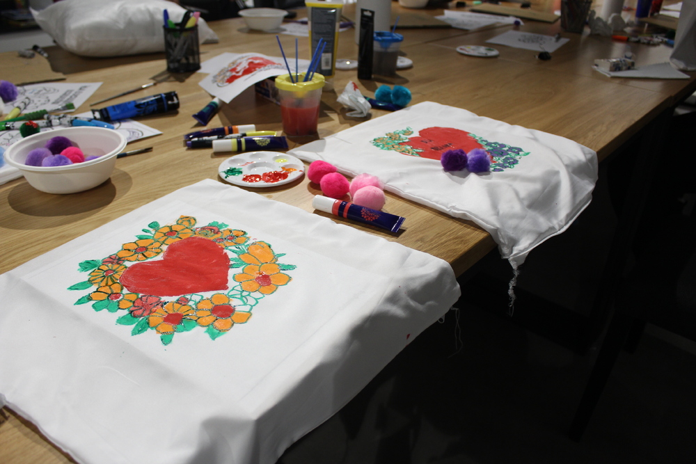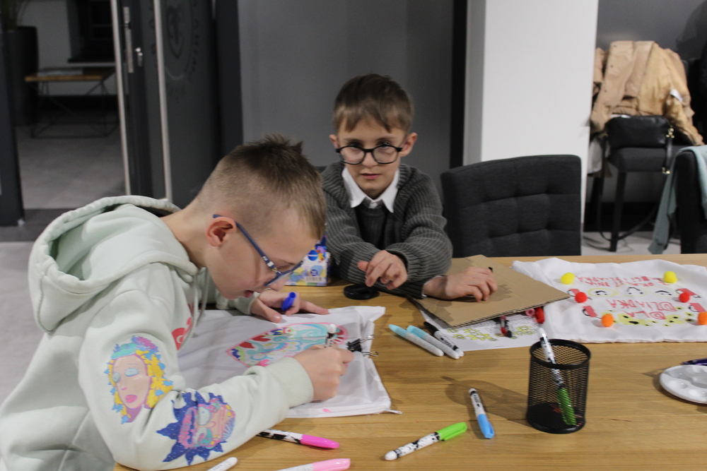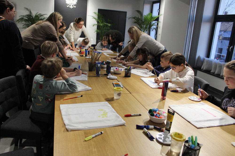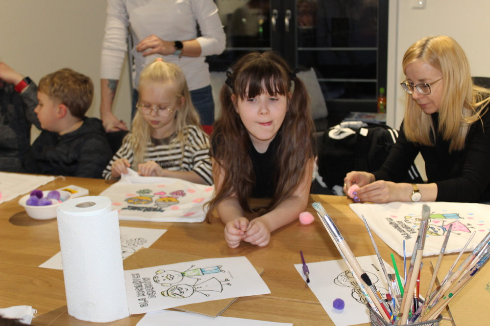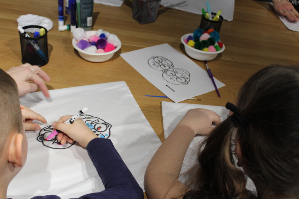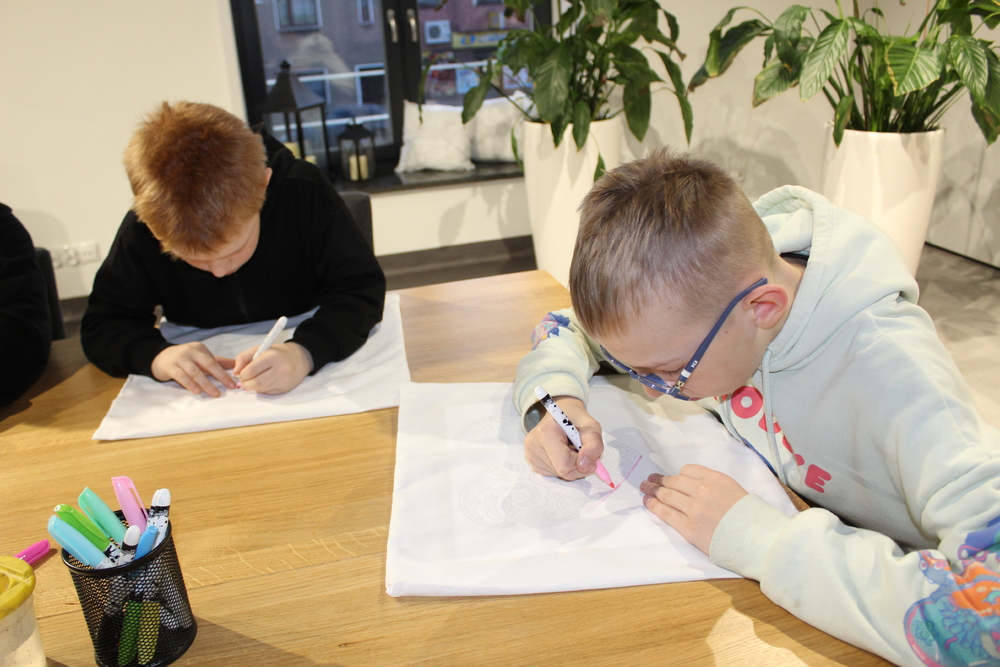 Podczas warsztatów wykorzystano specjalne szablony, farby do tkanin oraz pastele i pisaki, które ułatwiły nanoszenie wzorów i napisów. Motywów do malowania nie brakowało! Na poszewkach pojawiły się kolorowe kwiaty, serduszka oraz własne inwencje twórcze dzieci. Dodatkową ozdobą stały się kolorowe pompony, które uczestnicy własnoręcznie przyszywali do poszewek. Pompony stanowiły efektowne wykończenie prac, dodając wyjątkowego i dekoracyjnego charakteru.