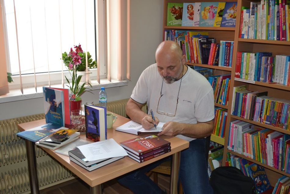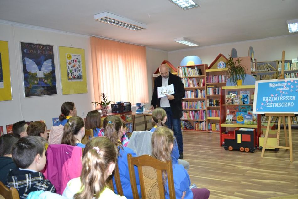 Wśród dzieci uczestniczących w spotkaniu byli uczniowie Szkoły Podstawowej w Baranowie i Donaborowie, którzy przybyli do biblioteki pod opieką swoich nauczycieli. Na początku spotkania pisarza przywitała dyrektor biblioteki – Edyta Lesiak, a następnie gość w kilku zdaniach się przedstawił. Kazimierz Szymeczko jest autorem popularnych książek dla dzieci i młodzieży, opowiadań w antologiach, tekstów do podręczników szkolnych i reklam radiowych. Z wykształcenia polonista, bibliotekarz i pasjonat historii. Wychowawca, opiekun, pokojowy, asystent osób niepełnosprawnych. Podczas spotkania autor bardzo interesująco opowiadał o swojej twórczości i pasji pisania. Jak mówił, pierwszy jego literacki tekst ukazał się w 1996 roku w „Guliwerze”, a potem ukazywały się już jego opowiadania i książki. Dalsza część spotkania przebiegała już w formie rozmowy – dzieci zadawały pytania, a miały ich mnóstwo. Pytały gościa m.in. o to ile książek napisał, co robi oprócz pisania, co go skłoniło żeby zostać pisarzem, a także o to co robi w wolnym czasie. Pisarz ze sporą dozą humoru odpowiadał na każde pytanie, prowadząc żywy dialog z publicznością. Przy okazji pokazywał swoje książki, w tym: serię „Zdarzyło się w Polsce”, Sprawa dla rozsupływacza”, „Kopidoł i Kwiaciareczka’, „Tetrus” „Pościg za czarną Hondą”, „A to historia”. Jak podczas każdego spotkania autorskiego na koniec dzieci ustawiły się w kolejce po autograf. Książki Kazimierza Szymeczko znajdują się w zbiorach biblioteki w Baranowie, Mroczeniu i Słupi.