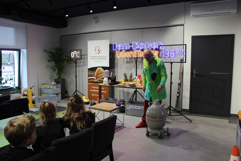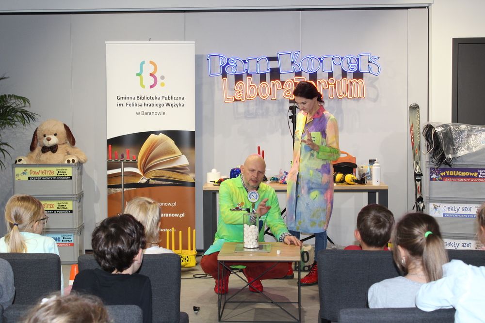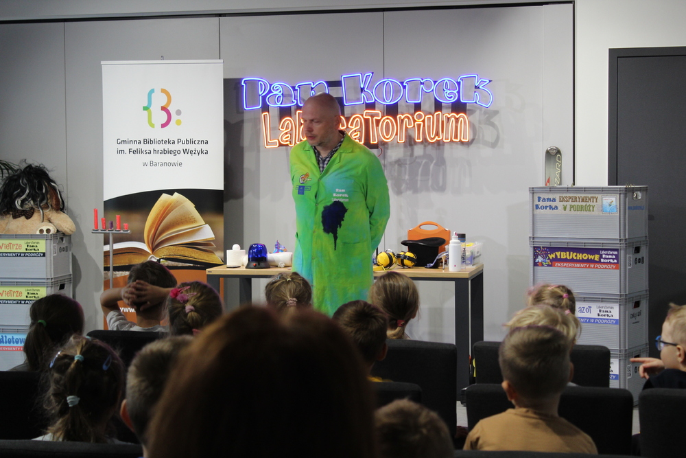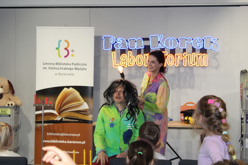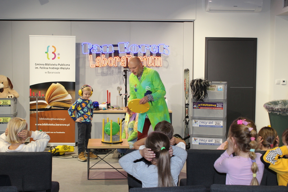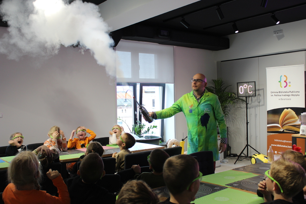 29 października w Gminnej Bibliotece Publicznej w Baranowie odbył się edukacyjny pokaz naukowców z Laboratorium Pana Korka, którzy podróżują po Polsce i prezentują widowiskowe eksperymenty z wielu dziedzin nauki. W zajęciach uczestniczyły grupy przedszkolne z Przedszkola „Bajka” z Baranowa oraz dzieci z oddziału zerowego z Zespołu Szkół w Mroczeniu.