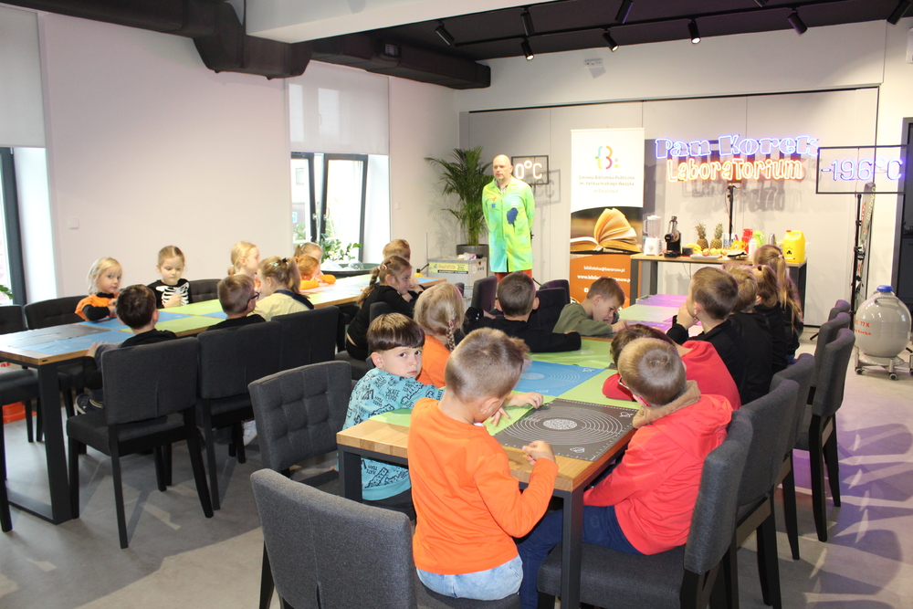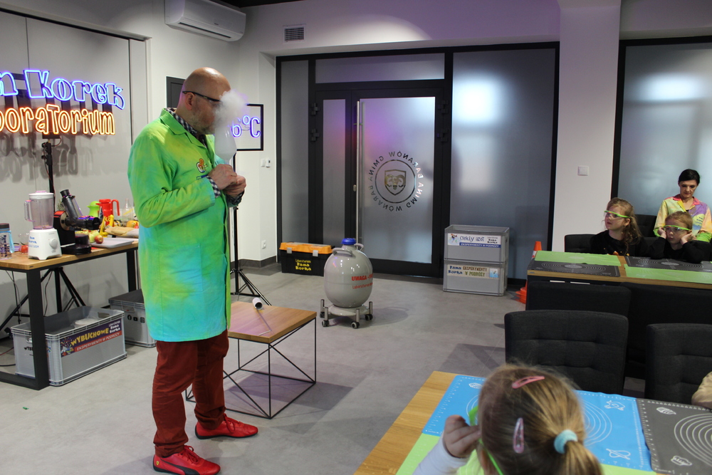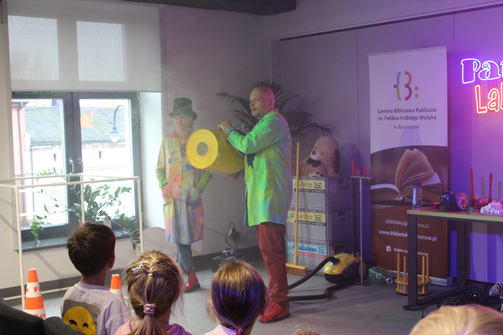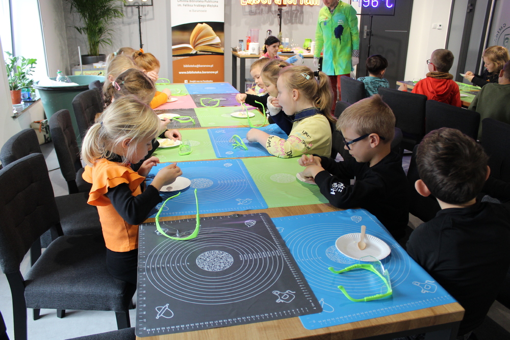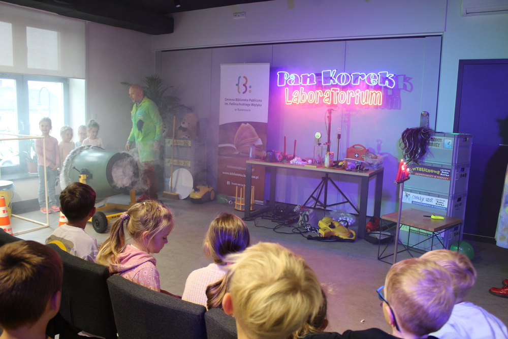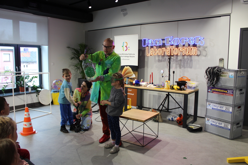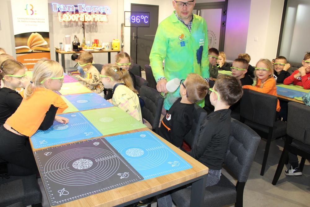 29 października w Gminnej Bibliotece Publicznej w Baranowie odbył się edukacyjny pokaz naukowców z Laboratorium Pana Korka, którzy podróżują po Polsce i prezentują widowiskowe eksperymenty z wielu dziedzin nauki. W zajęciach uczestniczyły grupy przedszkolne z Przedszkola „Bajka” z Baranowa oraz dzieci z oddziału zerowego z Zespołu Szkół w Mroczeniu.