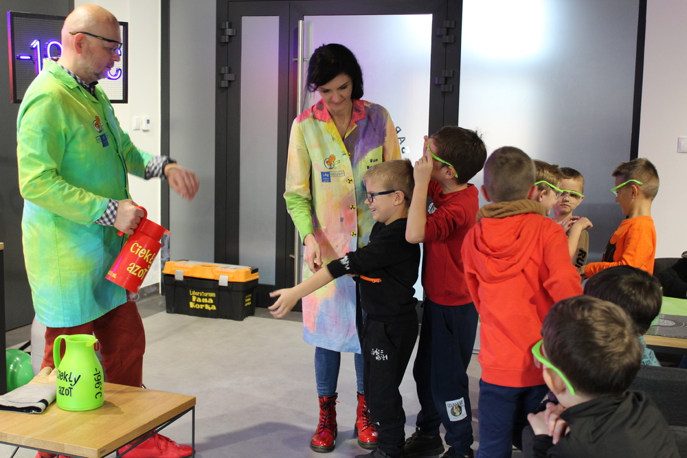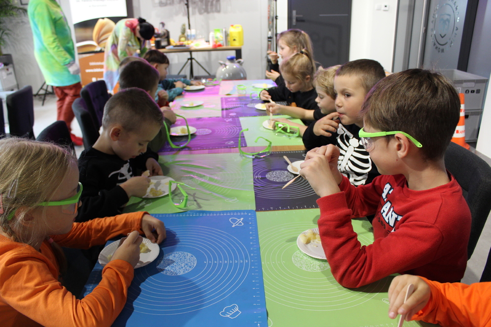 W drugiej części spotkania odbyły się warsztaty dotyczące kuchni molekularnej pn. „Azotowe lody”. Przedszkolaki dowiedziały się, czym jest suchy lód, ciekły azot i jakie ma właściwości. Pod okiem naukowców tworzyli smaczne, dymiące chrupki, zanurzone w ciekłym azocie, które dostarczyło wielu smakowych wrażeń. Na naukowy deser serwowano pyszne lody zrobione ze świeżych bananów i ananasów, które każdy miał okazję skosztować. Spotkanie okazało się wybuchową przygodą, pełną zaskakujących i niezapomnianych wrażeń.