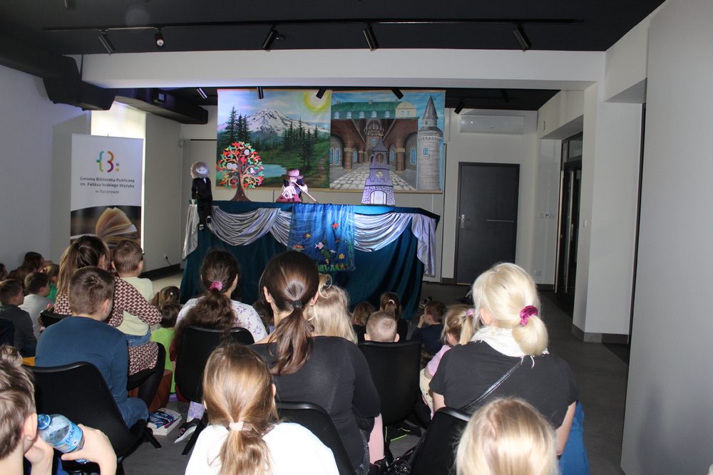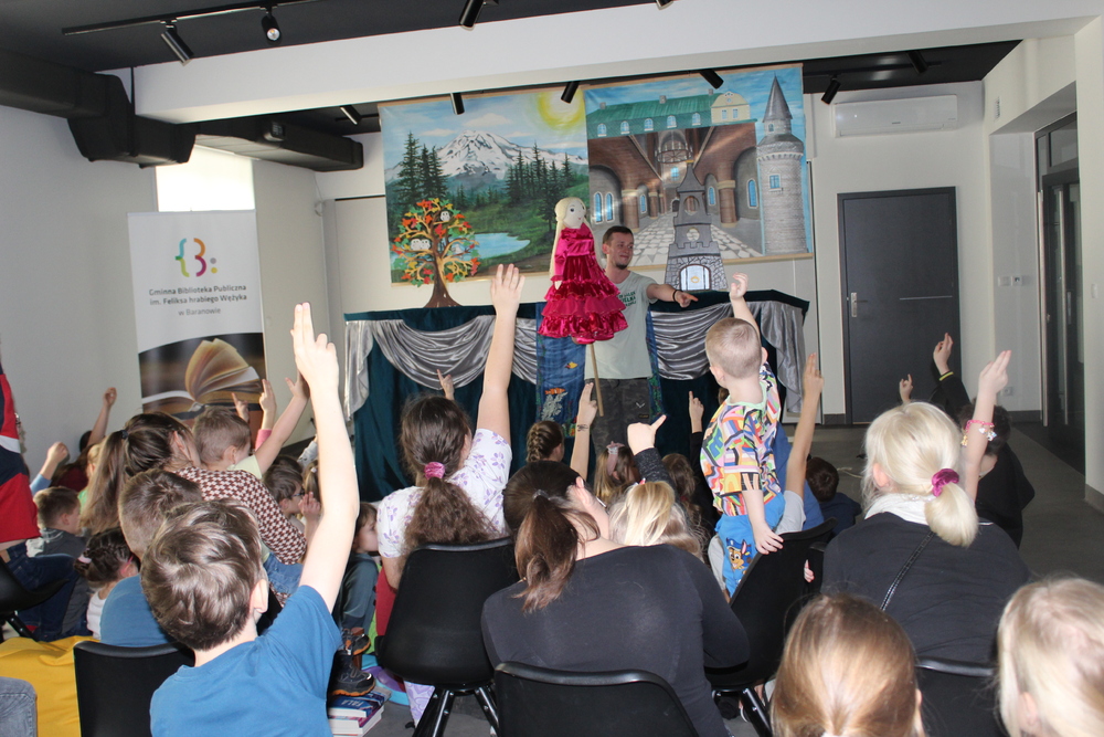 Przedstawienie obejrzeli uczniowie ze Szkoły Podstawowej w Baranowie i Słupi, seniorzy, a także dzieci, które w tym dniu odwiedziły bibliotekę. Baśń została oparta na starych polskich podaniach ludowych, która opowiada o Szewczyku, wędrującym przez świat w poszukiwaniu przygód. Pouczająca historia, wspaniała dekoracja oraz dodatkowe atrakcje w postaci dymów scenicznych oraz baniek mydlanych sprawiły, że wszyscy z zaciekawieniem słuchali opowieści. Dla chętnych przygotowano również specjalne zadania związane z przedstawieniem. W spektaklu wystąpiło 15 lalek, ręcznie wykonanych przez Muzeum Lalki w Pilźnie. Po spotkaniu dzieci zostały zaproszone pod scenę, gdzie każdy miał możliwość poznać rodzaje lalek, ich budowę, samodzielnie spróbować ruchu scenicznego i zrobić pamiątkowe zdjęcie. Dzieci otrzymały również kolorowanki oraz krzyżówki, by po powrocie z biblioteki utrwalić wiadomości związane z teatrem.