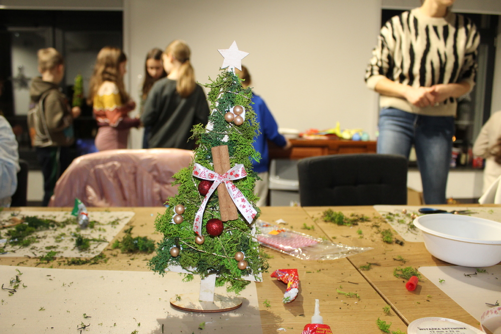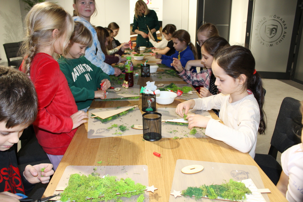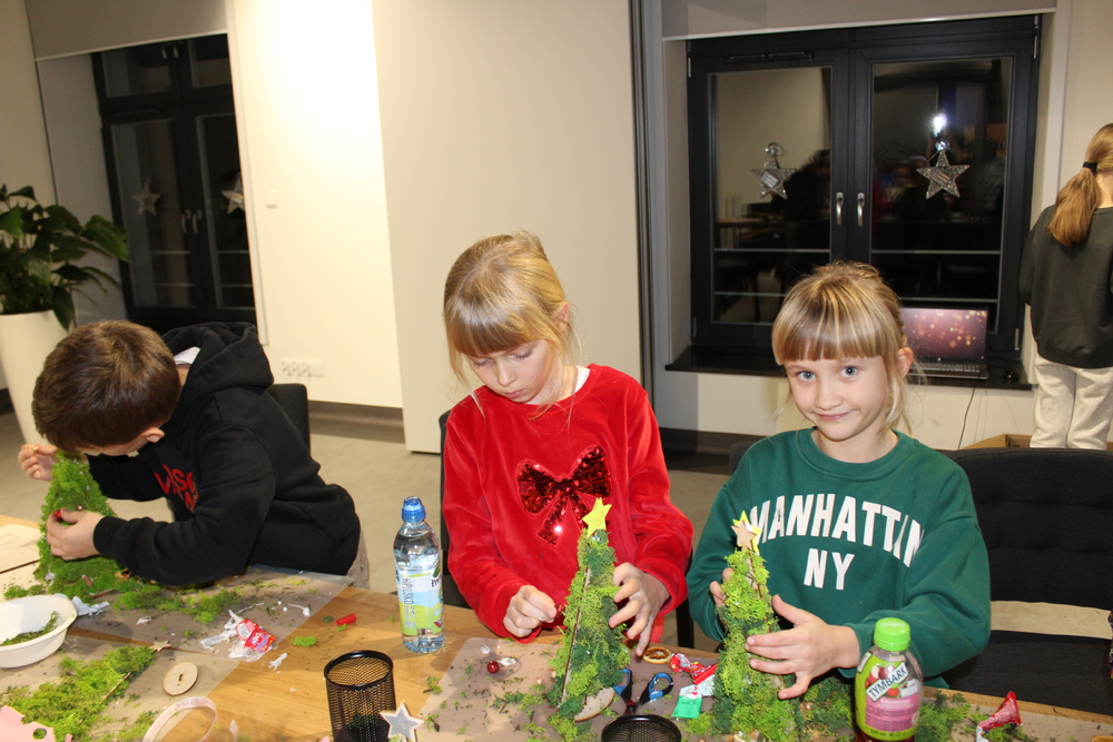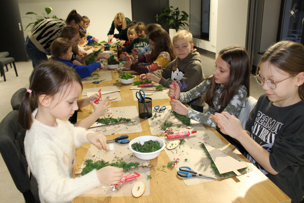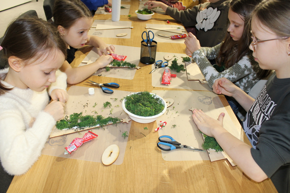 Dzięki wysłuchaniu opowiadania pt. „Od gałązki do drzewka”, przeczytanej przez Edytę Lesiak – dyrektora biblioteki i Annę Kaczmarek – bibliotekarza, uczestnicy dowiedzieli się o tradycjach i zwyczajach bożonarodzeniowych w różnych częściach świata, co wprowadziło wszystkich w świąteczną atmosferę. Po wspólnej rozmowie na temat zbliżających się świąt, dzieci zabrały się do twórczej pracy. Każdy miał okazje spróbować swoich umiejętności z użyciem świątecznych dodatków, które dodały dekoracjom elegancji. Dzieci z zapałem wycinali, kleili, malowali, a przede wszystkim dobrze się bawili. Podczas warsztatów powstały prawdziwe dzieła sztuki. Każda z nich to nie tylko piękna dekoracja, ale także pamiątka pełna wspomnień i radości z wspólnej pracy. Serdecznie dziękujemy wszystkim uczestnikom za kreatywność i wspólnie spędzony czas.
