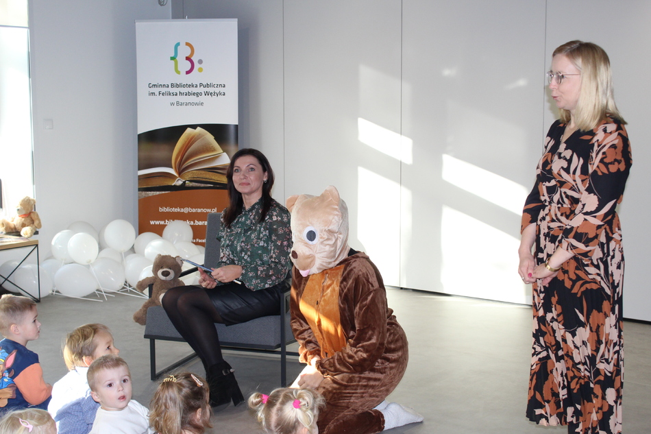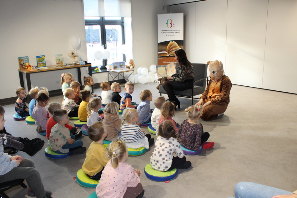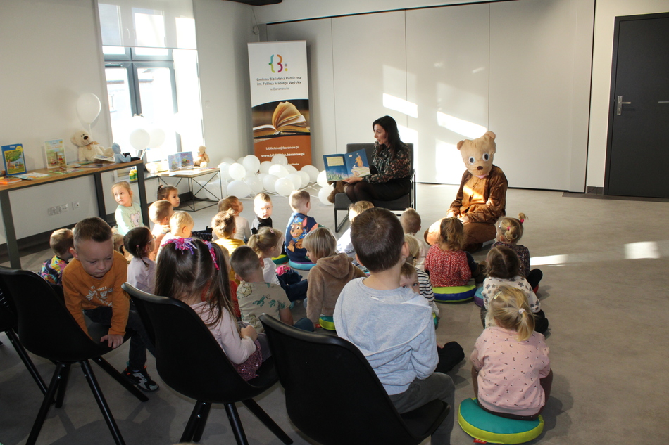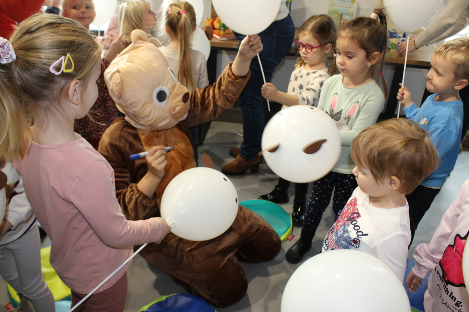 24 listopada w Gminnej Bibliotece Publicznej w Baranowie obchodzono Światowy Dzień Pluszowego Misia. W spotkaniu wzięły udział dzieci z Przedszkola Barankowo wraz z nauczycielami. Przedszkolaki wspólną zabawę rozpoczęły od wysłuchania jednej z przygód misia z książki pt. „Marzenie małego Misia”, którą przeczytała Pani Sylwia Adamska - kierownik USC Gminy Baranów. Gościem specjalnym był również Pluszowy Miś, który bawił się razem z dziećmi. Zwieńczeniem spotkania było samodzielne wykonanie misia z balona. Wszystkie dzieci doskonale poradziły sobie z tym zadaniem. Zainteresowaniem cieszył się także kącik książek o misiach, które można wypożyczyć w naszej Bibliotece. Na zakończenie nie mogło zabraknąć pamiątkowych zdjęć z Misiem, jak również słodkie „małe co nieco”. To było bardzo miłe spotkanie. Dziękujemy za wspólną zabawę.