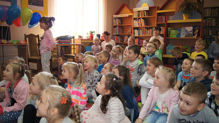 Podczas wizyty przedszkolaki miały również okazję zwiedzić placówkę i z zaciekawieniem oglądały regały pełne książek. W podziękowaniu za spotkanie, dzieci wyrecytowały wiersze, zaśpiewały piosenkę o książkach oraz wręczyły kwiaty. Na zakończenie otrzymały zakładki do książek i kolorowe baloniki.