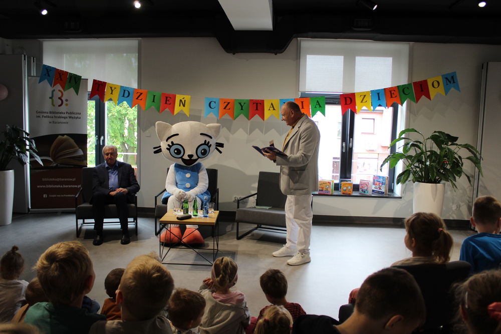 W spotkaniu uczestniczyły dzieci z Przedszkola „Mruczuś” w Mroczeniu, którzy z wielkim zaciekawieniem i rozbawieniem wysłuchały bajki „Kicia Kocia w bibliotece”, którą przeczytali dla nich: Andrzej Tyra – dyrektor Zespołu Szkół w Mroczeniu, sama bohaterka czytanej książki – Kicia Kocia oraz Mirosław Sokołowski z Urzędu Gminy w Baranowie.