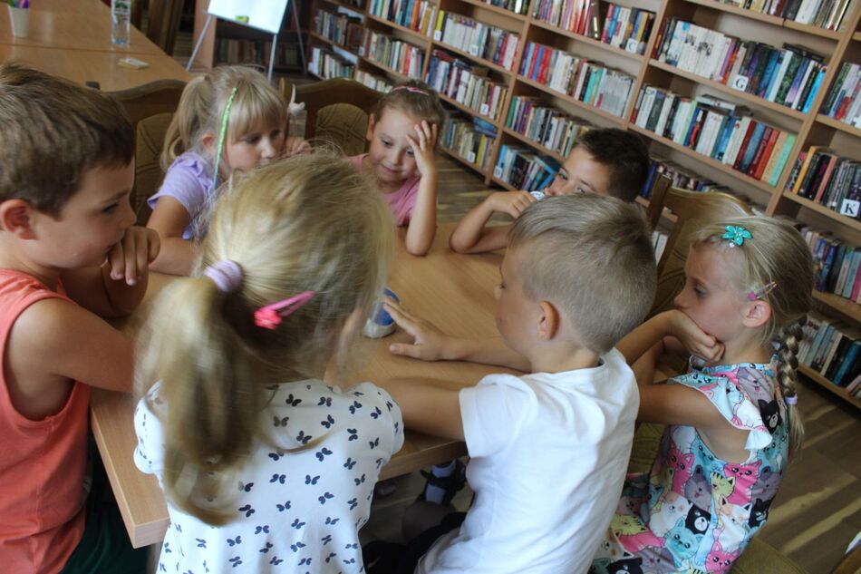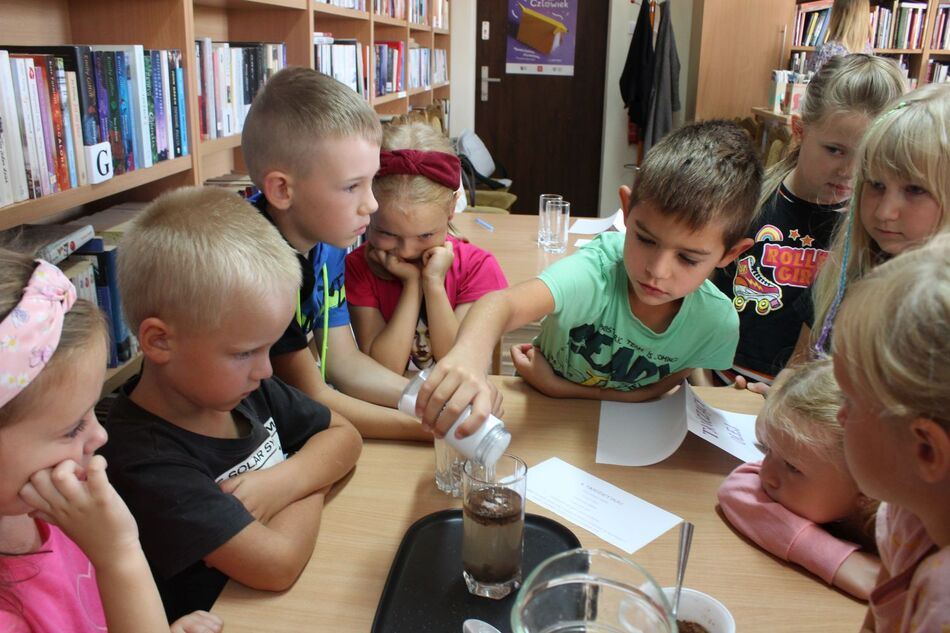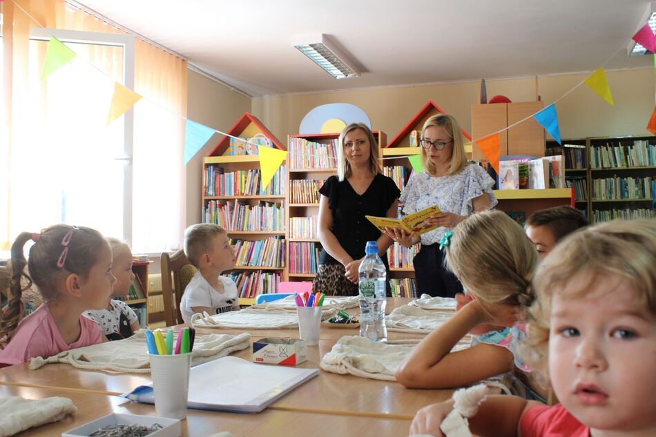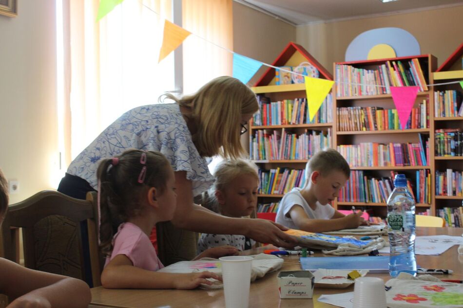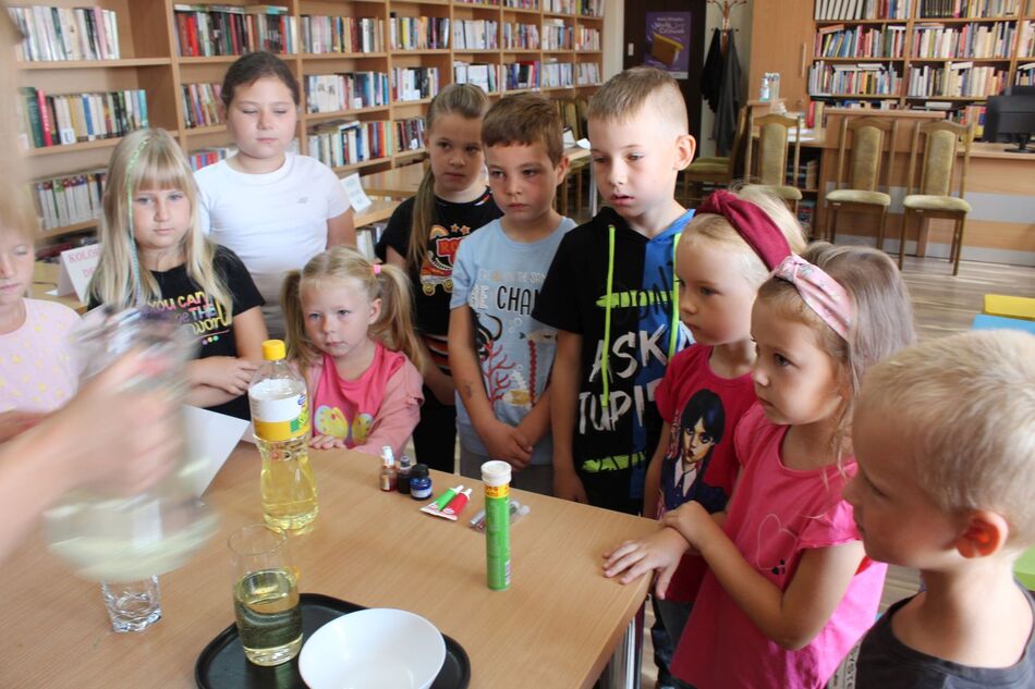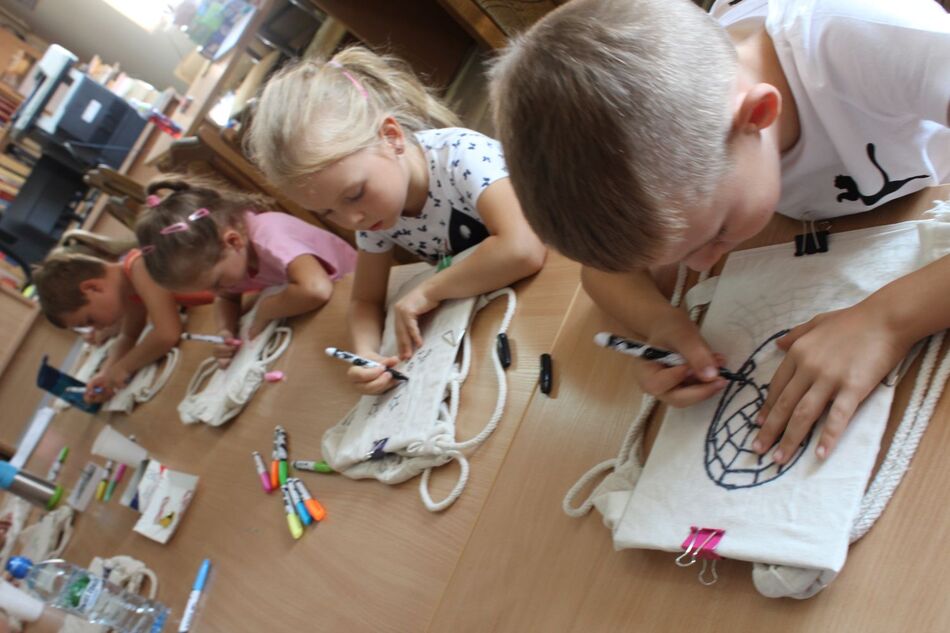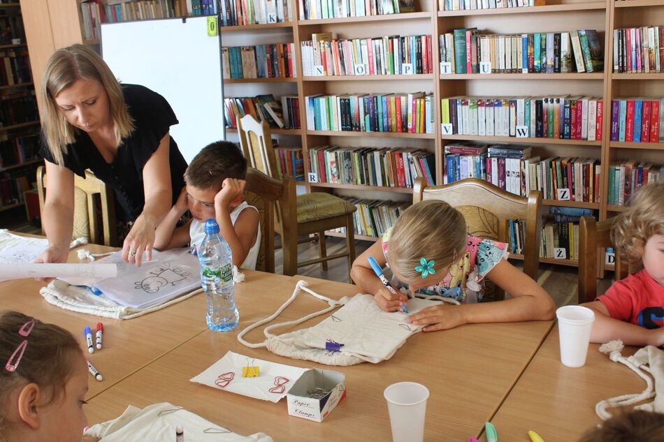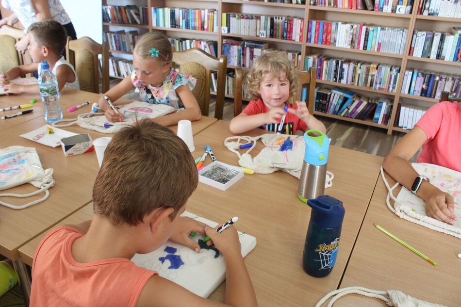 W Filii bibliotecznej w Mroczeniu zakończyliśmy tegoroczne warsztaty wakacyjne dla dzieci pn. „Barwy lata”, które odbywały się od 11 do 25 sierpnia. Dzięki ich różnorodności najmłodsi mogli rozwijać swoją wyobraźnię i sprawność manualną, a wspólne czytanie i zabawy pozwoliły im się zintegrować. Warsztaty zostały przygotowane oraz przeprowadzone przez dyrektor książnicy Edytę Lesiak oraz bibliotekarza Annę Kaczmarek. W trakcie pierwszych zajęć dzieci miały okazję eksperymentować z mieszaniem kolorów i tworzyły prawdziwe dzieła sztuki podczas wspólnych doświadczeń z wykorzystaniem głównie wody, kolorowych barwników i artykułów spożywczych. Efektem wspólnych działań była: „Lampa Lawa”, „Kolorowy deszcz”, „Burza w szklance wody” i „ Tańczący olej”, na koniec powstały „Kolorowe wulkany”. Wszystkie eksperymenty udały się znakomicie, było kolorowo i inspirująco! W drugim tygodniu każdy miał okazję spróbować swoich sił w zajęciach manualnych. Po wysłuchaniu instrukcji, uczestnicy zabrali się do malowania kolorowym piaskiem. Na każdego czekał już szablon, który należało wypełnić barwnym piaskiem. Malowanie piaskiem daje nieograniczone możliwości stworzenia ozdoby o dowolnym kształcie, kolorze i wielkości. Jest ciekawą formą „przesypywania” kolorowych fantazji na papier. Wymagało to skupienia i precyzji, ale efekt końcowy zachwycił wszystkich. Tematem ostatnich warsztatów były twórcze torby ręcznie malowane. Zajęcia polegały na malowaniu tkanin, najpierw poprzez obrysowanie wybranego szablonu na ekologicznym worku, następnie na wypełnieniu wzoru specjalnymi mazakami do tkanin. Dzieci wykazały się dużą kreatywnością i starannością, projektując i malując niepowtarzalne, własnoręczne techniki. Czas wakacyjnych zajęć upłynął pracowicie, kreatywnie i bardzo kolorowo. Każde ze spotkań kończyło się również wypożyczaniem książek. Bardzo dziękujemy wszystkim uczestnikom za udział w zajęciach i zaangażowanie.